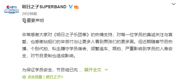 非常感謝大家對《明日之子樂團季》的熱情支持,對每一位學員的真誠關注與喜愛,也感謝站姐們的辛苦付出讓更多人看到男孩們的更多面。但近期隨著節目熱播,個別代拍、私生蹲守學員宿舍,頻繁追車、跟拍,嚴重影響到學員的人身安全,對節目錄制也造成影響。