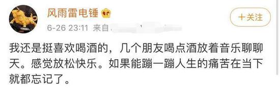 趙小棠之前也被指自曝是“夜店咖”,她在自己的小號“風雨雷電錘”上表示:“自己還是挺喜歡喝酒的,如果能蹦一蹦人生的痛苦在當下就都忘記了。”
