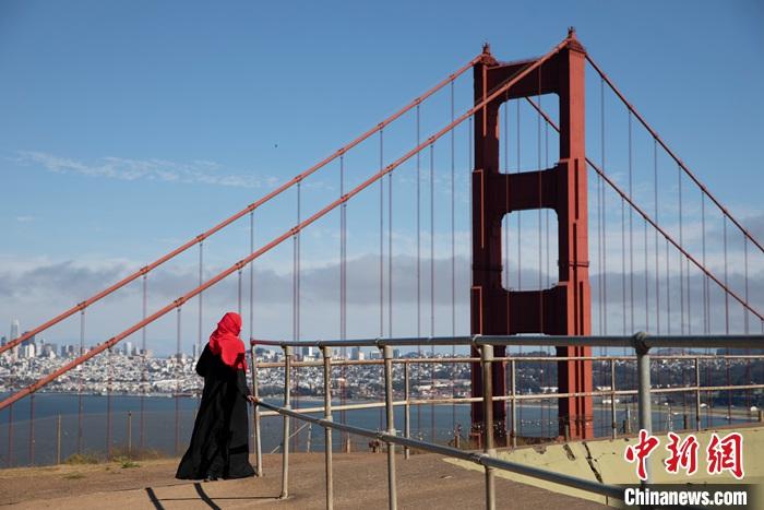 當地時間7月21日,游客在美國加州舊金山金門大橋附近游玩。