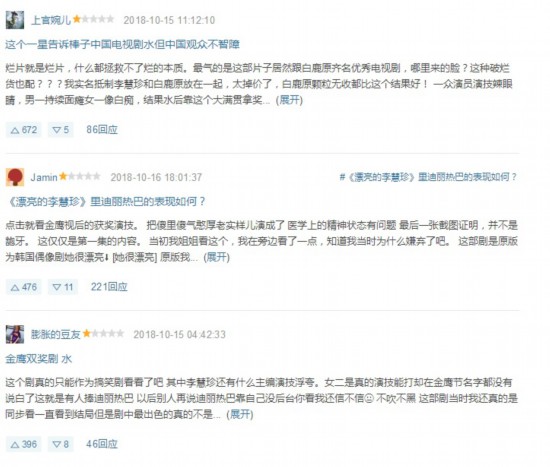 有粉絲努力刷分控評,就有“看不下去”的純路人怒打一星。在一些影視劇評分中,常見這樣的短評:“本來可以給三星的,但看不下去粉絲刷五星,給個一星平衡一下”。此前金鷹獎將最佳女主角頒給出演《漂亮的李慧珍》的迪麗熱巴,引發不少網友不滿開打1星,原本評分還不到5分的影片被打到了3.0分。