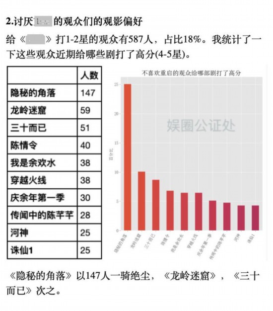 有“技術流”網友通過大數據分析了給該劇打分情況。在3259條評分中,587人給出了1-2星,而這些給出低分的觀眾,近期給《隱秘的角落》《龍嶺迷窟》和《三十而已》等片打出了4-5星的高分,這些影片的確是近期大眾口碑較好的影片。
