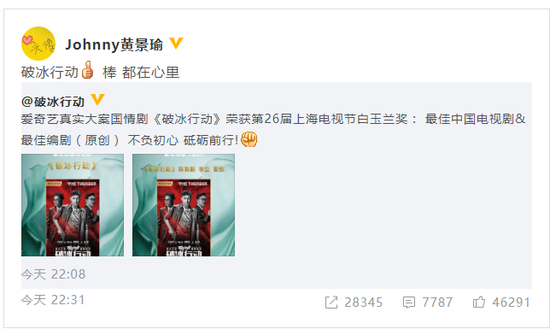網(wǎng)易娛樂8月8日?qǐng)?bào)道 第26屆上海電視節(jié)白玉蘭獎(jiǎng)?lì)C獎(jiǎng)。黃景瑜發(fā)文慶祝其主演的電視劇《破冰行動(dòng)》獲得最佳中國電視劇,表示“破冰行動(dòng), 棒!都在心里”。