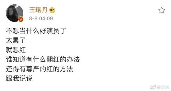 網(wǎng)易娛樂8月8日?qǐng)?bào)道 近日凌晨,王珞丹發(fā)文稱自己不想當(dāng)什么好演員了,只想紅,并在線向網(wǎng)友征集“有尊嚴(yán)的翻紅方法”,隨后她刪除了這條微博。