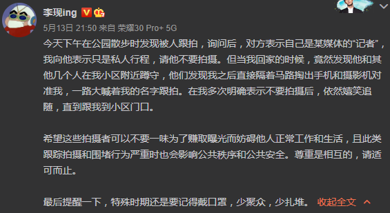 5月13日,李現就曾發文斥狗仔的偷拍行為,他表示:“今天下午在公園散步時發現被人跟拍,詢問后,對方表示自己是某媒體的‘記者’,我向他表示只是私人行程,請他不要拍攝。但當我回家的時候,竟然發現他和其他幾個人在我小區附近蹲守,他們發現我之后直接隔著馬路掏出手機和攝影機對準我,一路大喊著我的名字跟拍。在我多次明確表示不要拍攝后,依然嬉笑追隨,直到跟我到小區門口。希望這些拍攝者可以不要一味為了賺取曝光而妨礙他人正常工作和生活,且此類跟蹤拍攝和圍堵行為嚴重時也會影響公共秩序和公共安全。尊重是相互的,請適可而止。最后提醒一下,特殊時期還是要記得戴口罩,少聚眾,少扎堆?!?/p>
