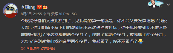網易娛樂8月9日報道 8月8日晚,李現在社交平臺發文斥狗仔:“今晚狗仔偷拍又被我抓到了,見我說的第一句就是:你不會又要發微博吧?我說大哥,你明知道我私下和拍戲期間不喜歡被拍被打擾,你干嘛還要如此不依不饒地跟蹤我呢?我這戲都拍兩個多月了,你跟了我兩個多月,被我抓了兩個多月,未經允許劇透我們戲的造型兩個多月。我都累了,你還不累嗎?”