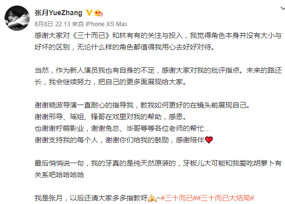 網易娛樂8月9日報道 8月8日晚,熱播劇《三十而已》迎來大結局,張月在社交平臺發文告別林有有,她寫道:“感謝大家對《三十而已》和林有有的關注與投入,我覺得角色本身并沒有大小與好壞的區別,無論什么樣的角色都值得我用心去好好對待。當然,作為新人演員我也有自身的不足,感謝大家對我的批評指點。未來的路還長,我會繼續努力,把自己的更多面展現給大家。”并感謝劇組人員的幫助和大家的鼓勵,她還透露:“我的牙真的是純天然原裝的,牙板兒大可能和我愛吃胡蘿卜有關系吧”,十分搞笑。