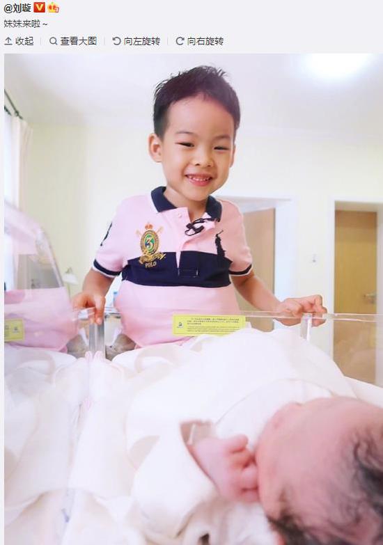 照片中,劉璇的大兒子表情興奮,一直盯著襁褓中的妹妹看,雖然小寶寶沒有露出正臉,但是皮膚粉嫩,頭發(fā)濃密。