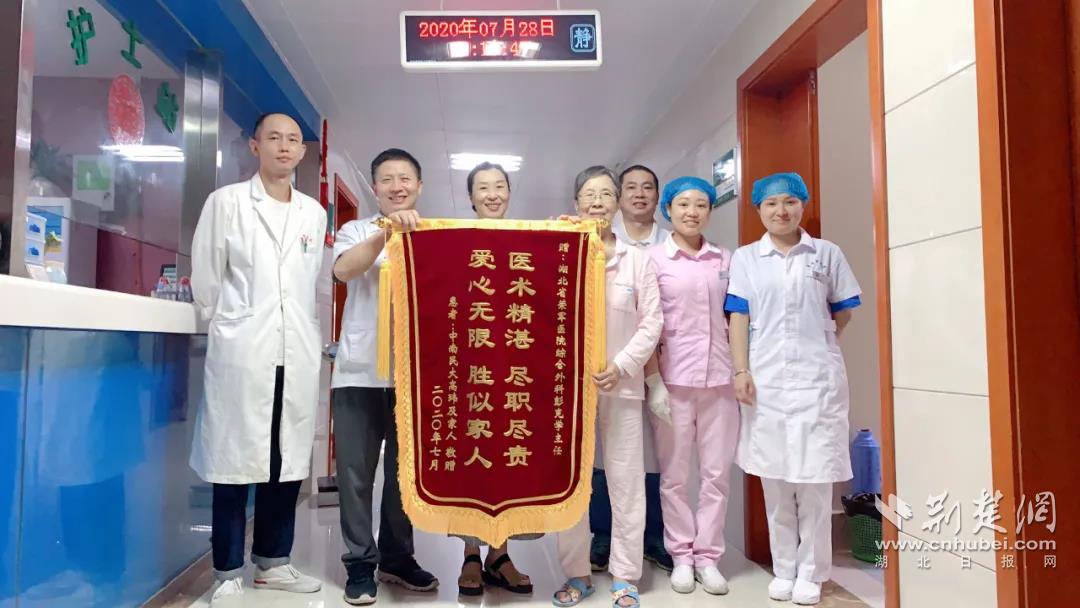荊楚網(wǎng)客戶端—荊楚網(wǎng)消息(通訊員 孫四海)“我年紀(jì)大了,而且還有基礎(chǔ)病,要上手術(shù)臺說不怕是假的,但是是彭主任,給了我信心。”近日,湖北省榮軍醫(yī)院治愈出院的患者高奶奶和家屬把印有“醫(yī)術(shù)精湛 盡職盡責(zé) 愛心無限 勝似家人”字樣的錦旗送到外三科醫(yī)護(hù)人員手里,真誠地表達(dá)自己的感激之情。