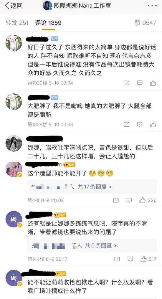 在歐陽娜娜工作室評論全是粉絲在勸歐陽娜娜多練練唱歌,勸她不要用這種“慵懶頹廢唱腔”唱所有歌,值得一提的是,評論前排幾乎全是她的鐵粉,路人網友紛紛表示:“看過狙工作室的,這還是第一次看到粉絲狙本人的。”其實歐陽娜娜有這樣一群粉絲是好的,有錯誤就應該指出,這樣粉絲和偶像才能一起進步,不好的地方要說出來,藝人才能得到進步。