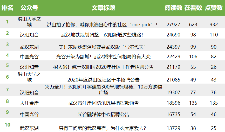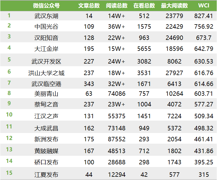 “武漢東湖”7月WCI指數(shù)飆升,主要原因為其原創(chuàng)內(nèi)容傳播力進(jìn)一步增強(qiáng)。其原創(chuàng)文章不僅有2篇入選本期文章閱讀量排行前十榜單(如表2),且從原創(chuàng)文章排行前十來看,前8名均被來自“武漢東湖”的內(nèi)容占據(jù),其所有文章的平均閱讀量也較6月增加了2022次,平均在看數(shù)增加了65次。