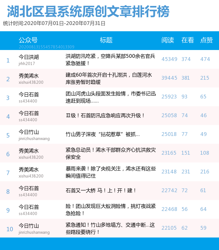 8月17日,由荊楚網(wǎng)(湖北日報(bào)網(wǎng))、楚天輿情數(shù)據(jù)研究院制作的湖北區(qū)縣微信排行榜7月榜單發(fā)布,“硒都發(fā)布”“孱陵在線”“今日石首”名列前三。7月,我省多個(gè)區(qū)縣遭受嚴(yán)重洪澇災(zāi)害,抗洪搶險(xiǎn)工作成為該月區(qū)縣微信公眾號宣傳的重點(diǎn),從巧借多方力量集中宣傳、救災(zāi)防災(zāi)安全教育并重、評論互動形成共情等方面發(fā)力,做好抗洪搶險(xiǎn)類宣傳。