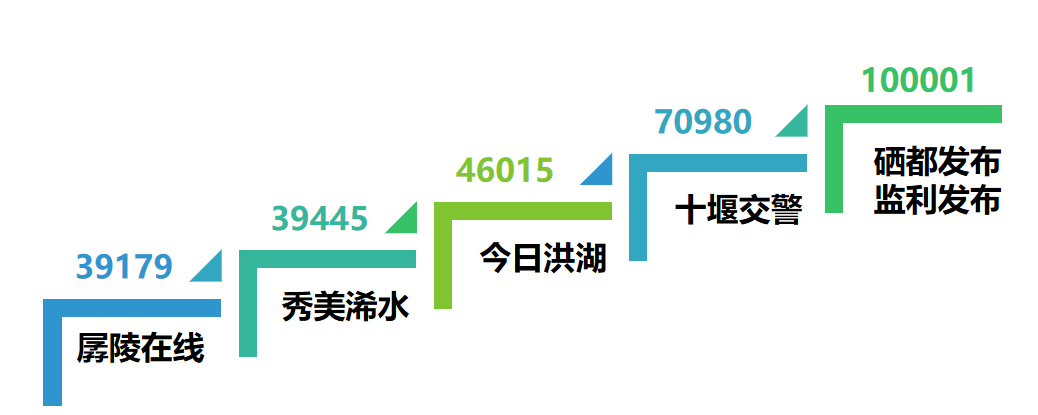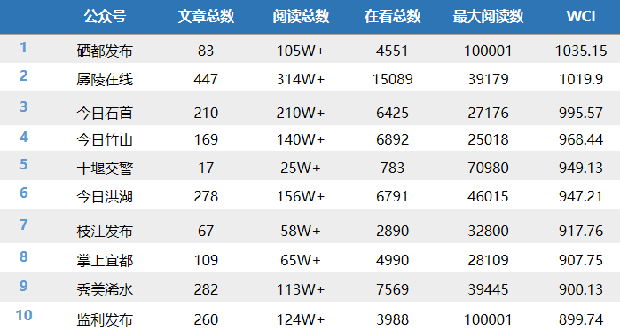 從最大閱讀數(shù)來看,“硒都發(fā)布”和“監(jiān)利發(fā)布”各收獲一篇10萬+文章,“十堰交警”也有閱讀量7萬的文章。特別是“十堰交警”的文章總數(shù)只有17篇,但因單篇文章閱讀量和傳播力“給力”,也能夠“榜上有名”。而榜單中多個(gè)公眾號最大閱讀數(shù)多為兩三萬左右,說明在單篇文章閱讀數(shù)方面還可以持續(xù)發(fā)力。