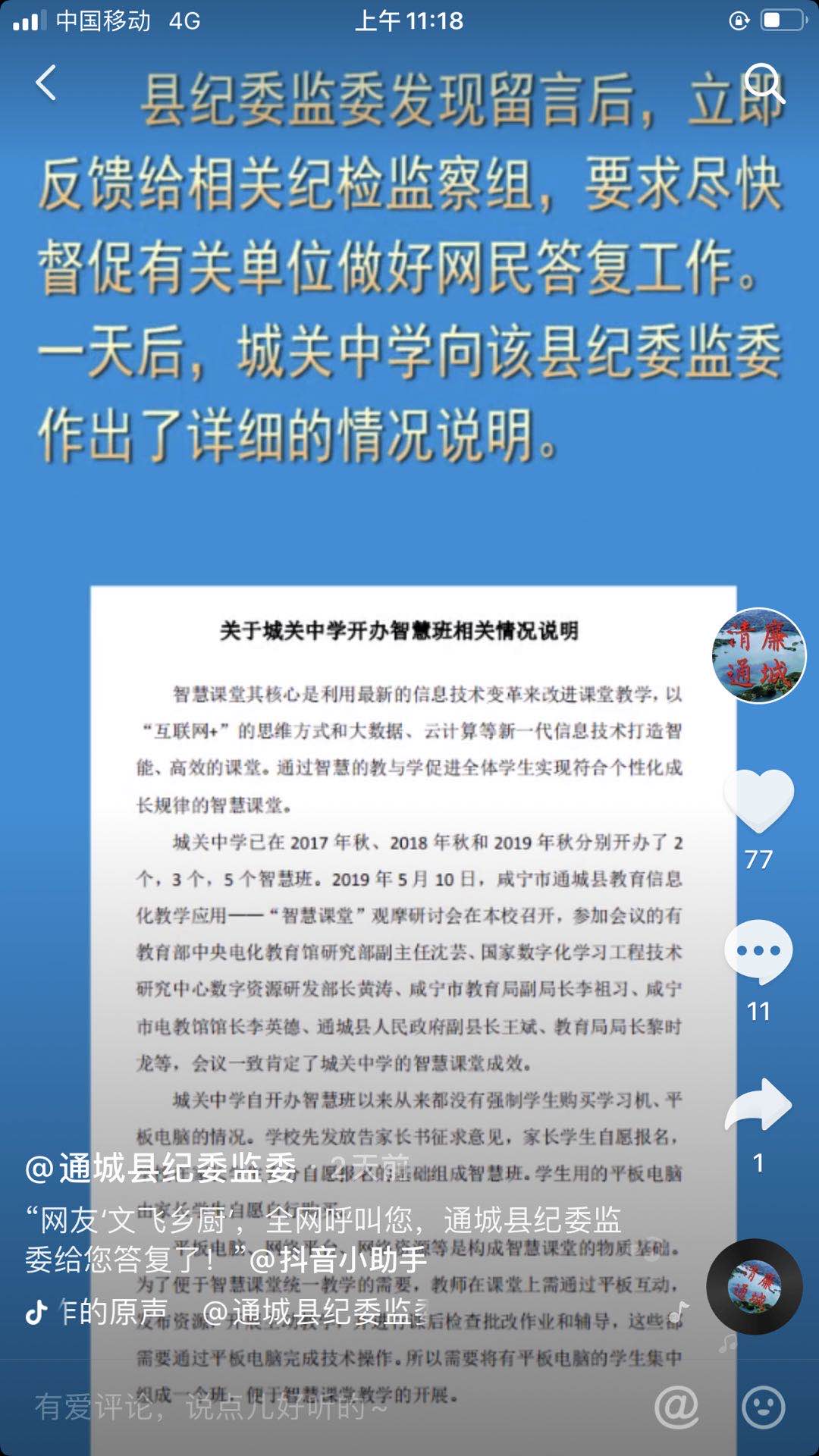該縣紀委監委宣傳部在抖音平臺監測到后,立即將留言反饋給相關的紀檢監察組,要求盡快做好網民答復工作。當天被網友“文飛鄉廚”質疑的城關中學向該縣紀委監委作出了詳細的情況說明。城關中學將該校為做好教學改革,根據上級有關部門支持打造智慧課堂的工作及與家長溝通的過程都作出了正面回應,縣紀委監委宣傳部再次在官方抖音聯系當事人回復,才有了剛才的一幕。