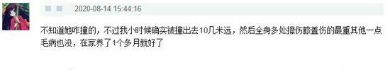 也有網友覺得吳宣儀沒必要在這種事上撒謊,而且現實生活中確實有人被撞后沒事。一位網友就分享了自己的一段經歷:“小時候確實被撞出去10幾米遠,然后全身多處擦傷膝蓋傷的最重其他一點毛病也沒,在家養了1個多月就好了”,認為吳宣儀的話是可信的。