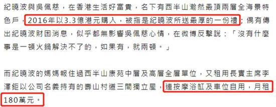 吳佩慈更以不足20元一尺,租予“泓港財務”,因為租金過低,所以被猜測是因為紀曉波借了錢的緣故,有豪宅地產經紀指做法常見于債主與欠債人之中。有網友懷疑,紀曉波可能因為自己的財困問題,所以遲遲未同吳佩慈領證結婚,用此來保證損失降至最低。