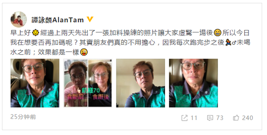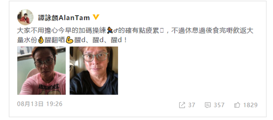他隨機在微博發文解釋,指因為加強訓練搞到有點疲倦,休息過后就沒有事,“大家不用擔心今早的加碼操練,的確有點疲累,不過休息過后吃了東西之后會補充大量水份”。