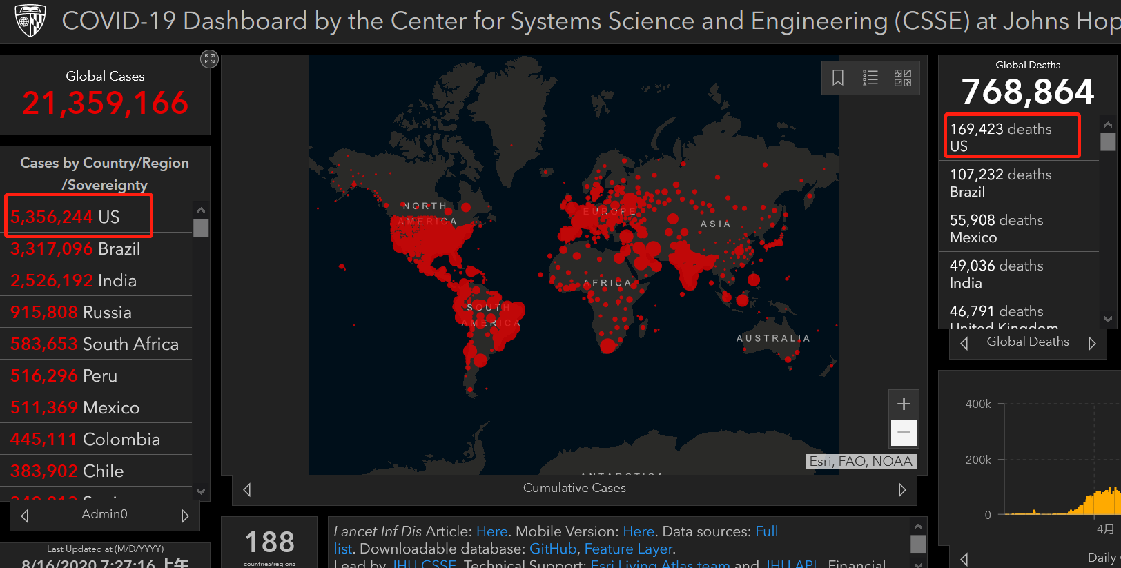 據(jù)美國約翰斯·霍普金斯大學(xué)的疫情實(shí)時(shí)統(tǒng)計(jì)數(shù)據(jù),截至目前,美國新冠肺炎確診病例達(dá)到5356244例,死亡病例接近17萬達(dá)到169423例。