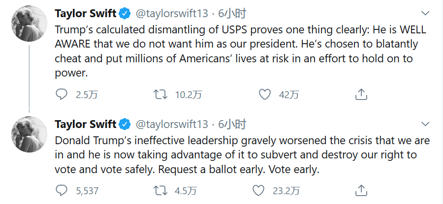 斯威夫特稱,“特朗普正在摧毀破壞我們的安全投票權(quán)。要求提前投票,提前投票。”