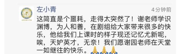 網易娛樂8月19日報道 電影演員、原北京電影學院教師謝園于8月18日突發心臟病,經搶救無效逝世,享年61歲。學生左小青發文悼念:“這簡直是個噩耗,走得太突然了!謝老師學識淵博,為人和善,在劇組給大家帶來很多的快樂,他給我們上課時的樣子現在還記憶猶新呢,唉,天妒英才,無奈!我們愿謝園老師在天堂一如既往的快樂?!?/p>