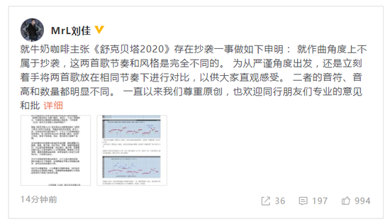 網易娛樂8月19日報道 何洛洛方回應新歌涉嫌抄襲一事后,《舒克貝塔2020》作曲者、制作人劉佳發聲明否認抄襲牛奶咖啡的《明天,你好》,并曬出歌曲對比,稱“兩者在節奏上有明顯差異,音符音高和數量也不同”,表示己方充分尊重原創,也愿意就此事與牛奶咖啡進行良好的溝通。