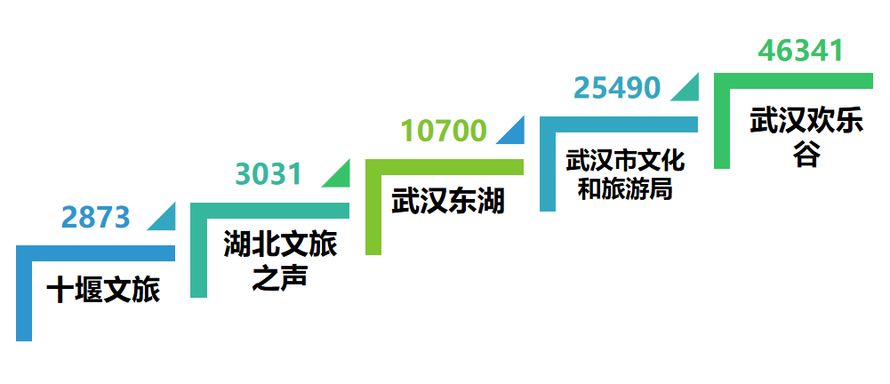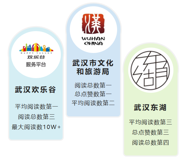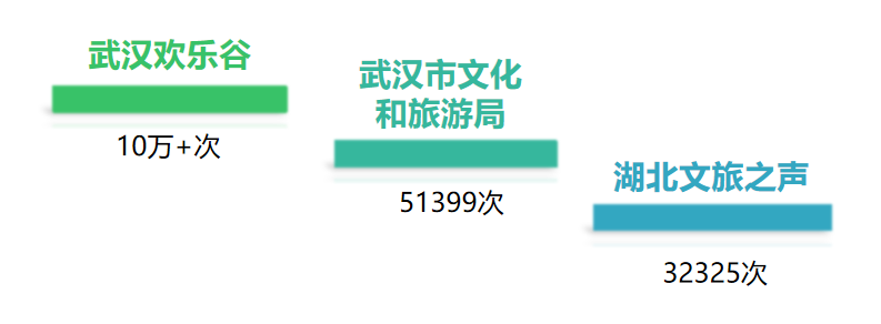 從閱讀總數來看,排名前五的依舊是“武漢市文化和旅游局”“湖北文旅之聲”“武漢歡樂谷”“武漢東湖”和“咸寧閑游”。從均篇閱讀數來看,“武漢歡樂谷”發文數雖僅有4篇,卻以均篇4.6萬+的閱讀量排名第一,較上月增長近2萬次,文章傳播效果有了更進一步的提升;“武漢市文化和旅游局”“武漢東湖”兩家公號該項指數也超過萬次。