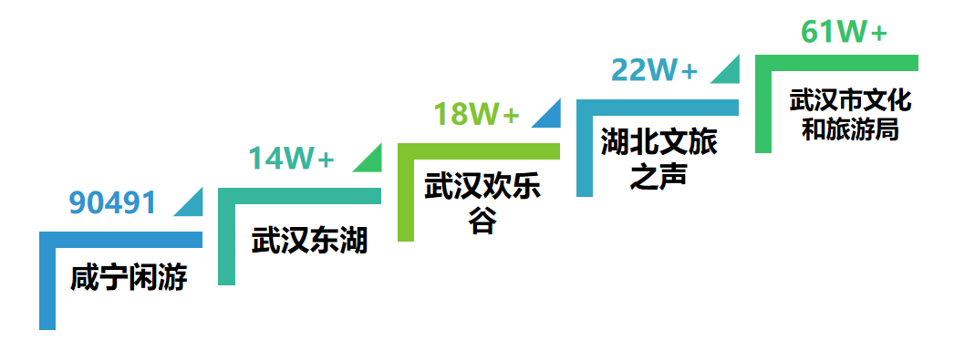 此外,《湖北:恢復經營跨省(市、區)團隊旅游》《一起爬山嗎?武漢真香日落》《全武漢都在逛!是什么熱鬧?》等微信文章因貼合我省推動文化和旅游行業復工復產大背景,為市民周末出行提供豐富選擇,也獲得了讀者的較高關注,助力“武漢市文化和旅游局”“湖北文旅之聲”等微信公號7月WCI指數上升。