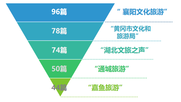 從文章總數來看,本月暫未有公眾號發文數超過100篇,整體發文量較上月出現小幅減少。具體來看,“襄陽文化旅游”以96篇位列第一,“黃岡市文化和旅游局”和“湖北文旅之聲”以78篇、74篇分列二、三名,“通城旅游”“嘉魚旅游”以50篇和44篇進入前五。WCI指數排名前20的微信公號7月發文數大多集中在20至30篇,僅有4家發文數少于10篇。