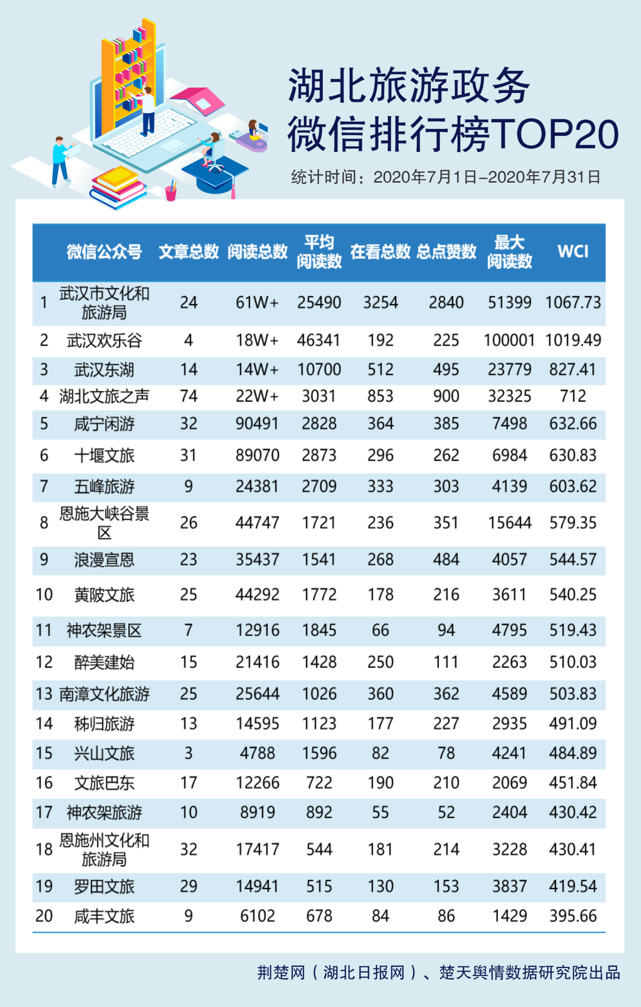 8月20日,由荊楚網(湖北日報網)、楚天輿情數據研究院制作的湖北旅游政務微信7月榜發布。本期,“武漢市文化和旅游局”“武漢歡樂谷”“武漢東湖”分列榜單第一、二、三名,上月榜單季軍“湖北文旅之聲”排名下滑至第四名。整體來看,榜單TOP20 WCI指數呈上升趨勢,其中“武漢歡樂谷”“興山文旅”指數漲幅均超過250,表現亮眼。