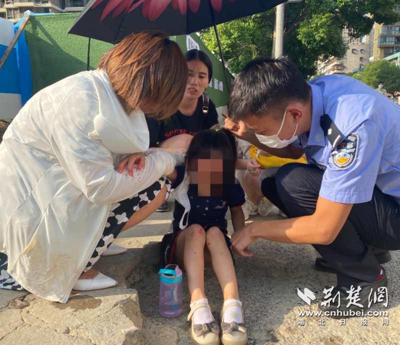 事發(fā)不久,武漢市交管局直屬大隊(duì)民警周艷、李祖運(yùn)、周天舉、徐天宇正好執(zhí)勤路過(guò)此地。“天氣很熱,小女孩因受傷哭鬧不止,讓人心疼。”李祖運(yùn)立刻拿來(lái)一把雨傘為她遮陽(yáng),同時(shí)安撫小女孩情緒。由于救護(hù)車還未到場(chǎng),為爭(zhēng)取送醫(yī)時(shí)間,在初步確認(rèn)小女孩無(wú)骨折情況后,李祖運(yùn)立刻將小女孩抱上車,在警車護(hù)送下,很快便到達(dá)醫(yī)院。目前,小女孩傷勢(shì)并無(wú)大礙。