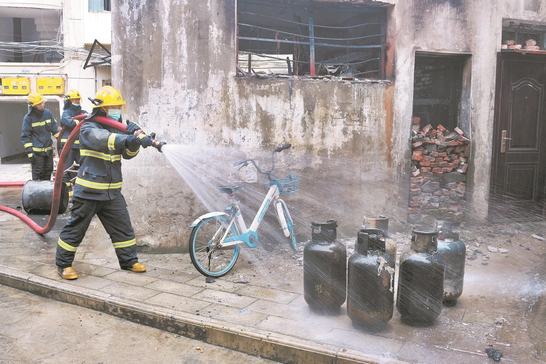 消防員給煤氣罐澆水降溫