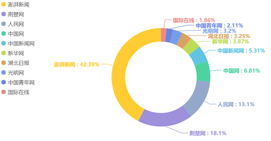整體來看,對本期上榜的各大醫院報道力度較大的省級以上主流媒體分別為澎湃新聞、荊楚網、人民網、中國網、中國新聞網、新華網、湖北日報、光明網、中國青年網、國際在線。其中,澎湃新聞相關報道占比42.39%,荊楚網占比18.1%,人民網占比13.1%。