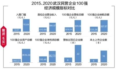 2015年,只要上年度營業收入達到3.07億元,就能進入武漢民營企業100強。到了2020年,這個門檻抬升到15.64億元,是5年前的5倍多。8月31日,“2020武漢民營企業100強、民營制造業企業50強”排序榜正式發布。武漢民營經濟向上生長的動力十足。
