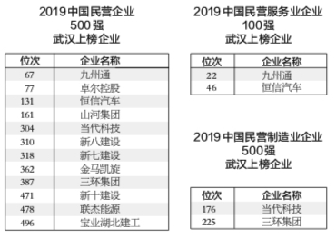 擁有一定數量的知名企業和優秀企業家,是一個城市綜合實力的體現。2019年,我市入圍中國民營企業500強企業12家,在全國15個副省級城市中位居第五,在湖北省民營企業100強占有63席。在企業發展壯大的同時,一批民營企業掌門人迅速成長,茅永紅、黃立分別當選全國工商聯副主席;2018年11月1日,黃立、閻志光榮出席全國民營企業家座談會;同年,茅永紅、鄭舉選榮獲國家百名“改革先鋒”稱號,茅永紅、黃立、閻志入選中央統戰部、全國工商聯“改革開放40年百名杰出民營企業家”;今年7月21日,黃立光榮出席了全國企業家座談會,并代表全國民營企業家發言,樹立了武漢企業家的良好形象。