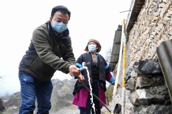 甘肅省甘南藏族自治州舟曲縣果耶鎮勒阿村第一書記張金利在村民家檢查自來水管
