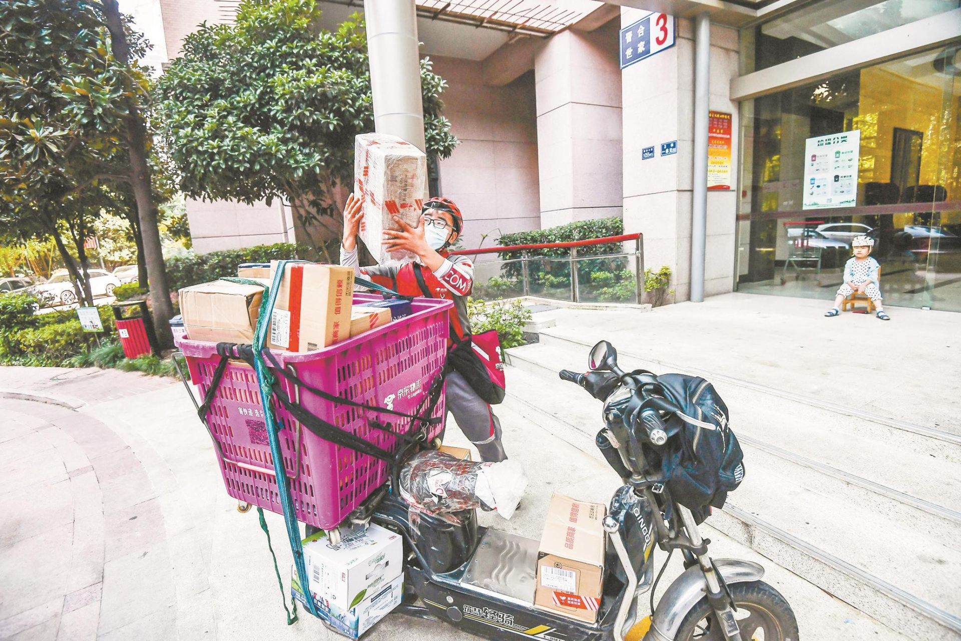一箱獼猴桃、兩箱牛奶、三箱紙巾、幾個袋裝包裹、幾箱泡沫盒裝的生鮮……他把貨物裝滿電動車上的貨筐,用繩子固定好,又轉身把女兒連同小木凳一起抱起,放在電動車尺寸剛好的腳踏板上。