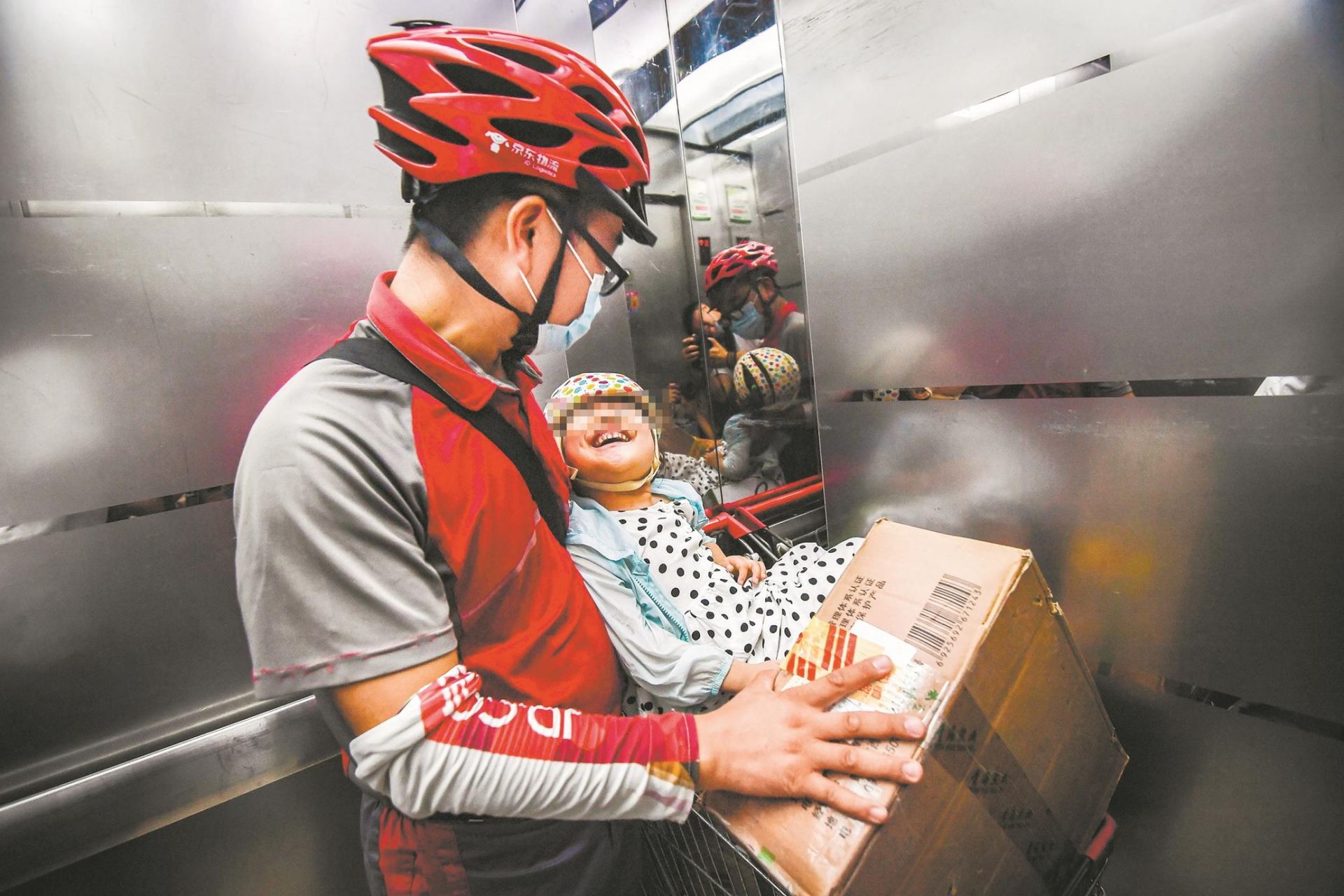來不及解下口罩,也顧不上脫掉帽子。快遞員接過家人遞來的小背包,確認水杯、午飯和小勺子都裝好后,把已經坐在小木凳上的小女孩連人帶凳一起抱起來,奔出了家門。這名快遞員叫楊壁,是京東物流武漢三眼橋營業部有著5年工齡的員工。自從家里二寶出生,他帶著患有腦癱的大女兒潼潼送快遞,至昨日已有14天了。
