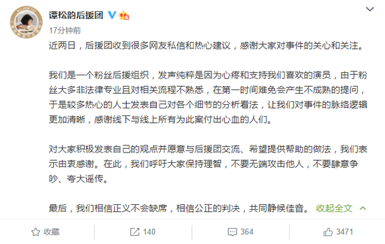 網(wǎng)易娛樂(lè)9月2日?qǐng)?bào)道 9月2日,譚松韻后援會(huì)再發(fā)文回應(yīng)針對(duì)譚松韻媽媽被撞案公開(kāi)庭審直播環(huán)節(jié)提出疑問(wèn)一事,表示“由于粉絲大多非法律專業(yè)且對(duì)相關(guān)流程不熟悉,在第一時(shí)間難免會(huì)產(chǎn)生不成熟的提問(wèn),于是較多熱心的人士發(fā)表自己對(duì)各個(gè)細(xì)節(jié)的分析看法,讓我們對(duì)事件的脈絡(luò)邏輯更加清晰,感謝線下與線上所有為此案付出心血的人們。”并呼吁大家保持理智,不要無(wú)端攻擊他人,不要肆意爭(zhēng)吵、夸大謠傳。相信正義不會(huì)缺席,相信公正的判決,共同靜候佳音。