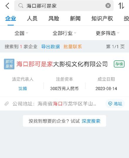 據(jù)企查查APP顯示,海口那可是家大影視文化有限公司于8月14日成立,公司所屬行業(yè)為新聞和出版業(yè),公司注冊(cè)資本為300萬(wàn)元,許可經(jīng)營(yíng)營(yíng)業(yè)性演出;廣播電視節(jié)目制作經(jīng)營(yíng);電影發(fā)行;電影放映等,企業(yè)地址位于華誼馮小剛電影公社南洋街附近,沈騰擔(dān)任該公司法定代表人,公司主要人員還包含沈騰妻子、監(jiān)事王琦。