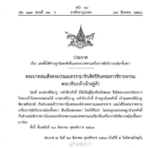 新浪娛樂訊 據微天下報道,泰國皇家憲報發布瑪哈國王8月29日頒發的圣旨,恢復詩尼娜一切王室頭銜,宮內軍職,軍銜,勛章,視為未曾被剝奪上述一切,自8月28日起生效。