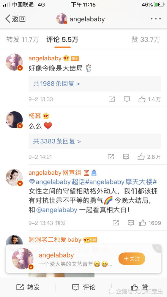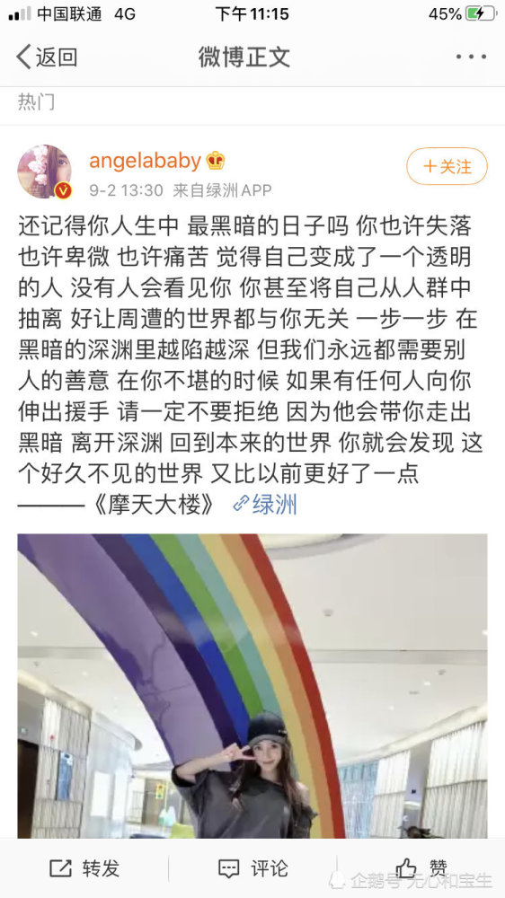 Angelababy發文告別《摩天大樓》,永遠不要拒絕別人的善意,走出黑暗,離開深淵,美寶真的被詮釋得很好,楊冪回復了“么么”。