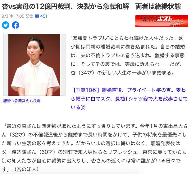 網易娛樂9月3日報道 據日媒,杏與親生母親的官司已經達成和解。杏的母親曾創設公司并簽下杏,但是她表示母親一直被騙子洗腦,騙走了不少錢,這些錢也都是公司買單,因此她希望離開公司。2015年,杏與母親在法院調解中未達成共識,2017年杏的母親選擇提起訴訟。今年4月,這場訴訟的內容被媒體曝出,關注度急劇上升。訴訟持續三年,杏和母親終于在8月達成和解。