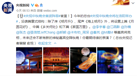 今年中秋晚會仍將沿襲堅持多年的篇章式結構,除了序《明月升》,尾聲《海上明月》之外,晚會還將設置上篇《月圓花好》、中篇《鄉關何處》、下篇《家國萬里》三個篇章。對于大家關注的央視秋晚歷屆的歌會形式以及全明星陣容,導演組表示,雖然受到新冠疫情的影響,但是今年的助演嘉賓和演員陣容依然很強大。據悉,目前已經有李宇春、江疏影、孫楠、張杰、張信哲、郎朗、周深、秦嵐、鹿晗等重量級明星確定加盟演出,屆時,還會有新的神秘嘉賓空降秋晚會。
