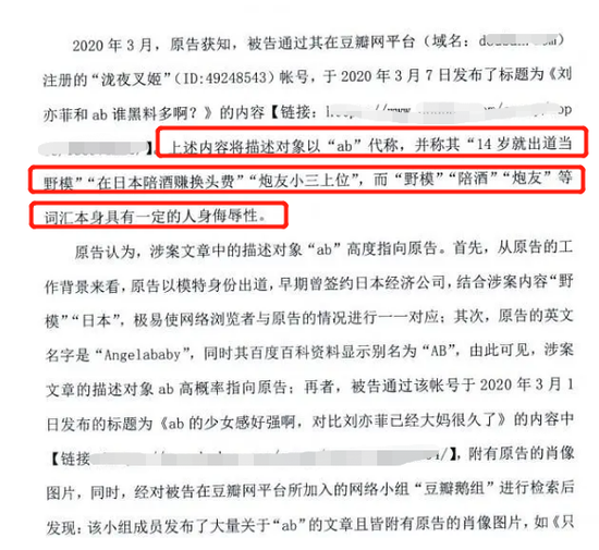 這不是baby第一次對網友提出起訴,之前有網友曾在論壇發布文章拉踩楊穎和劉亦菲,內容就是針對楊穎的外貌以及經歷進行抹黑與編撰,并稱其“14歲就出道當野?!薄霸谌毡九憔瀑崜Q頭費”“小三上位”等等,因此被baby起訴上告。
