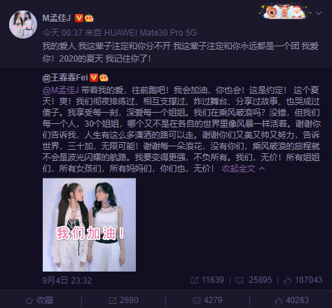 網易娛樂9月5日報道 9月4日晚,《乘風破浪的姐姐》成團之夜,孟佳成團,王霏霏遺憾沒成團。5日凌晨王霏霏發文喊話孟佳:“帶著我的愛,往前跑吧!我會加油,你也會!這是約定! 這個夏天!爽!我們徹夜排練過、相互支撐過、炸過舞臺、分享過故事、也哭成過傻子。我享受每一刻,深愛每一個姐姐。我們在乘風破浪嗎?沒錯,但我們每一個人,30個姐姐,哪個又不是在各自的世界里像風暴一樣活著。謝謝你們告訴我,人生有這么多瀟灑的路可以走。謝謝你們又美又帥又努力,告訴世界,三十加,無限可能!謝謝每一朵浪花,沒有你們,乘風破浪的旅程就不會是波光閃耀的航路。我要變得更強,不負所有。我們,無價!所有姐姐們,所有女孩們,所有媽媽們,你們也,無價!”