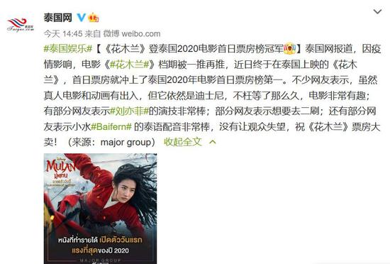 網易娛樂9月5日報道 據泰國網報道,因疫情影響,電影《花木蘭》檔期被一推再推,近日終于在泰國上映的《花木蘭》,首日票房就沖上了泰國2020年電影首日票房榜第一。