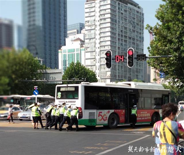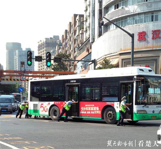5日上午10時,一輛公交車在行駛中突發故障,壞在利濟南路通往中山大道的路口。硚口區交通大隊民警楊彬趕到現場,協助司機將乘客轉走,同時呼叫了拖車。但這條路實在太窄,整個路都被這輛公交車堵死,如果等到拖車來不知會堵成啥樣。附近執勤輔警鄭偉、肖利學、周全跑過來幫忙,但不論他們如何用力,公交車依然不動。