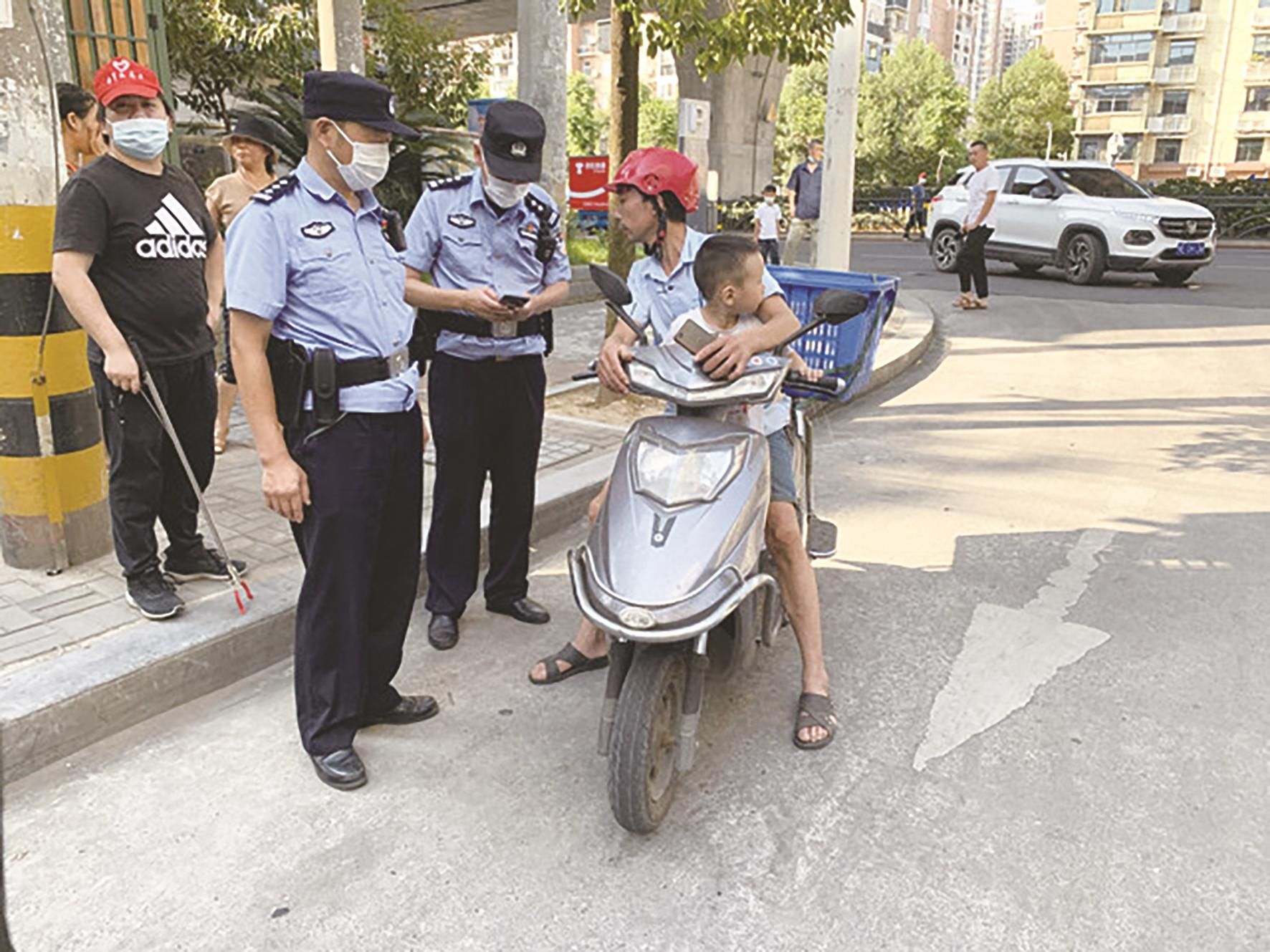 可能被當時的情景嚇呆了,男娃放聲大哭起來,“小紅帽”們趕緊輕拍男娃后背不停安慰他,待他平靜之后開始詢問其家人的情況,可男娃一語不發,十幾分鐘后仍然沒有說出家人信息。無奈之下,徐佳麗拔打了110。鼓樓派出所輔警喻智威趕來,男娃仍然不開口說話,正巧一騎摩托車路過的男子停下來看熱鬧,一眼認出男娃是他鄰居家孩子。原來,男娃的爸爸在四方堰菜場務工,見到熟人,男娃立馬追出來。派出所經確認無誤后,準許鄰居將孩子帶走。