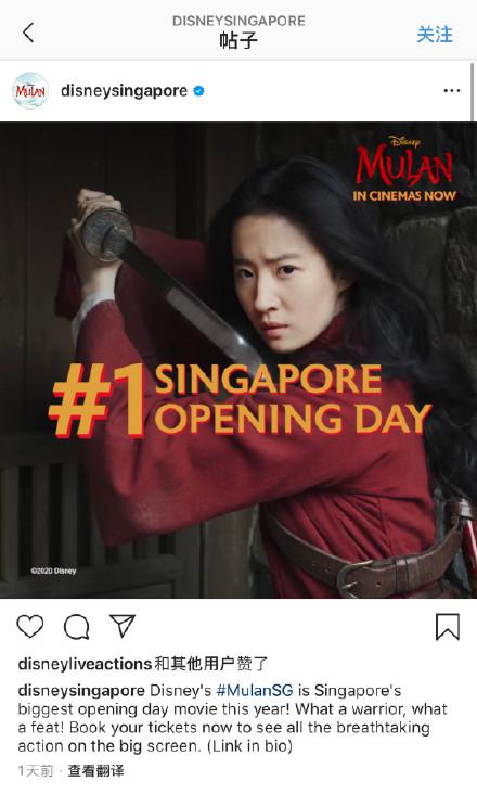 繼泰國后,《花木蘭》也成為了新加坡2020年電影首日票房榜冠軍!新加坡迪士尼官網在ins上發文宣布該消息,難掩喜悅之情。
