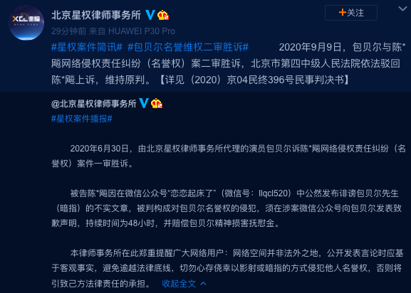 網易娛樂9月9日報道 9月9日,包貝爾維權案委托代理事務所北京星權律師事務所發文通告包貝爾名譽維權二審勝訴,法院維持一審原判。