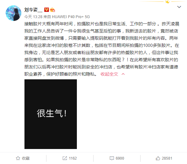 網易娛樂9月9日報道 今日,劉令姿發文斥責不良商家泄露她的膠片:剛新送去沖掃店的膠片,竟然被店家直接網盤發到微博,只需要輸入提取碼就能打開看到膠片的所有內容。兩年間在這家店沖洗過不少膠片,商家這樣泄露她的隱私讓她感到生氣和后怕。